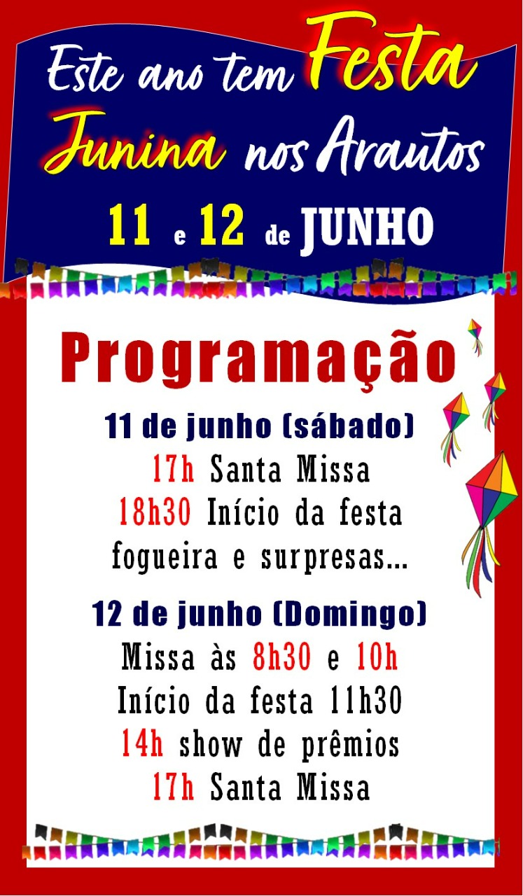 𝐅𝐄𝐒𝐓𝐀 𝐉𝐔𝐋𝐈𝐍𝐀 nos ᴀʀᴀᴜᴛᴏs ᴊᴏɪɴᴠɪʟʟᴇ𝐃𝐢𝐚 09/07:🔸17h: Santa Missa🔸18h30: Início da FestaAcendimento da fogueira 🔥𝐃𝐢𝐚 10/07:🔸10h: Santa Missa🔸11h30: Início da Festa🔸14h: Show de prêmios🔶️19h: Santa MissaLOCAL: Estrada Fernão André Gomes, 1500. Lateral da BR-101. KM-47 Sentido sul.